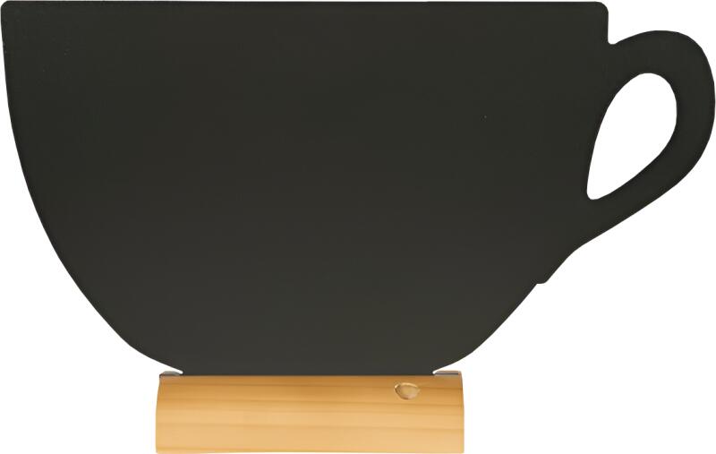Különleges csésze formájú asztali krétatábla, fa talppal. A talpnak köszönhetően biztosan áll az asztalon, polcon, vagy más vízszintes felületen. Krétamarkerrel írható, majd vizes ruhával könnyedén letörölhető. Használható éttermekben, otthonában, irodában, iskolában, óvodában, játszóházban stb. Reklámhordozónak, információs táblának, dekorációnak, üzenőtáblának egyaránt kiváló.